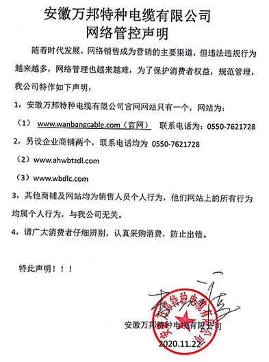 鄭重聲明:安徽萬邦特種電纜有限公司官方網站為:www_wanbangcable_com.longjingiu.cn,除此之外無任何子網站或合作網站,其余均為假冒偽劣。電話:0550-7621728 13485756353 地 址:安徽省天長市滁州高新技術產業開發區經四路29號